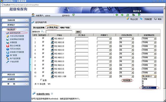 2. 在“監(jiān)控配置--> 監(jiān)控電腦列表--> 計(jì)算機(jī)列表”中應(yīng)用封堵規(guī)則,如下圖所示: