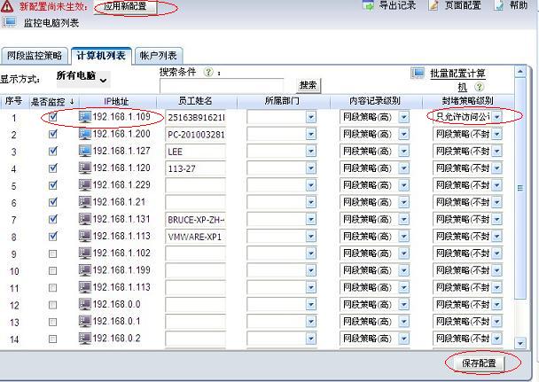 4.在“監(jiān)控配置-- >監(jiān)控電腦列表”中應(yīng)用封堵策略,如下圖所示: