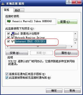 2. 選中“Internet協(xié)議(TCP/IP)”,點(diǎn)擊“屬性”按鈕,彈出“Internet協(xié)議(TCP/IP)屬性”對(duì)話框。