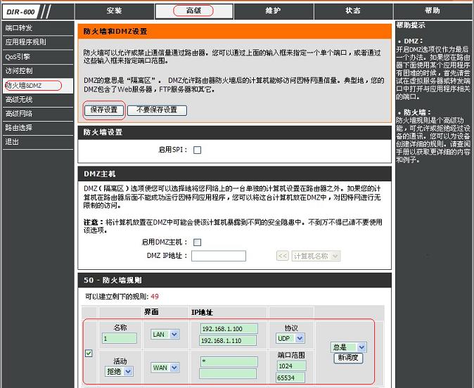 1. 首先登陸路由器,在“高級- - >防火墻&DMZ”里面對防火墻進行設置,具體設置如下圖所示: