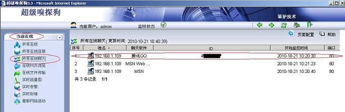 3. 接下來可以打開超級嗅探狗“當前在線- - >所有在線聊天”如果禁止生效;QQ會自動轉換成TCP 80或者443端口進行通訊;如果QQ使用8000端口進行通訊,說明UDP端口沒有禁止成功。QQ通訊協議可以參考:QQ通訊協議介紹。