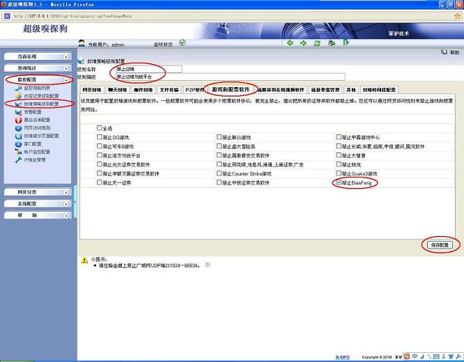 (2)打開超級嗅探狗,在“監控配置-- >封堵策略級別配置-- >編輯-- >禁止BianFeng”,配置如下如所示: