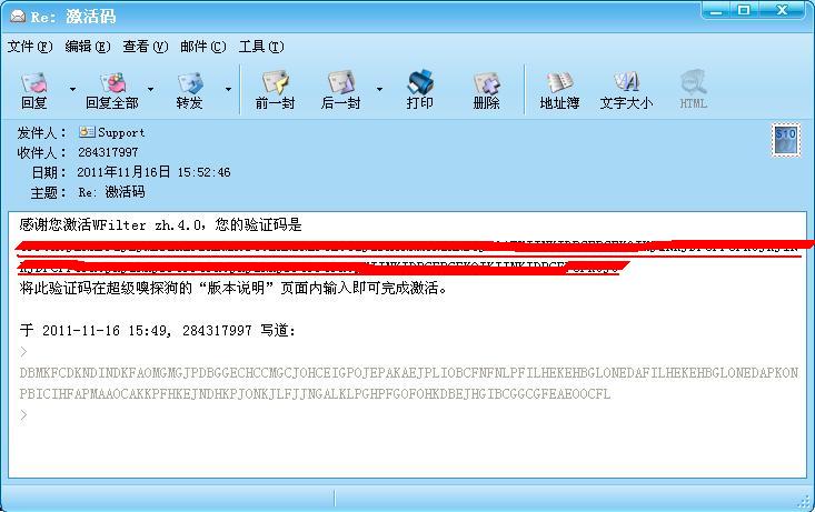 如果您選擇通過郵件的方式來激活您的產(chǎn)品,在對話框中輸入您購買時獲得的注冊碼,選擇郵件激活,點擊確定,頁面將返回一串激活碼,將激活碼的內(nèi)容通過郵件的方式發(fā)送到指定的郵箱中,公司將在兩個工作日內(nèi)將驗證碼發(fā)給您,把收到的驗證碼輸入到系統(tǒng),即可完成激活。