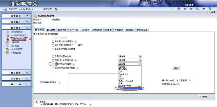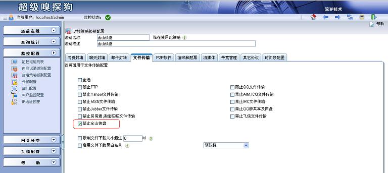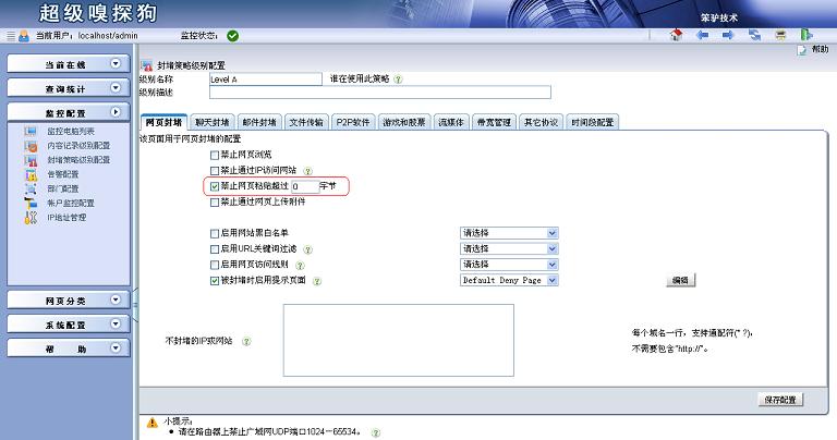 超級嗅探狗自帶網(wǎng)址庫,可以根據(jù)禁止網(wǎng)頁分類“網(wǎng)盤與文件共享”來禁止網(wǎng)盤類的相關(guān)網(wǎng)站,但是有些網(wǎng)盤客戶端軟件不能禁止掉。 1.在“監(jiān)控配置”->“封堵策略級別配置”中添加一個封堵級別,選擇“啟用網(wǎng)頁訪問規(guī)則”并新增一條規(guī)則。方法三:新建自定義協(xié)議