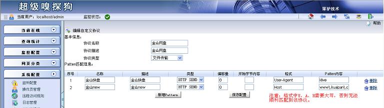 1. 在“系統(tǒng)配置”->“自定義協(xié)議”中添加“金山快盤”。將該協(xié)議特征加入到新增自定義協(xié)議。 類型:HTTP SEND ; 格式:User-Agent ; patten內(nèi)容:klive 類型:HTTP SEND ; 格式:Host ; patten內(nèi)容:www\.kuaipan\.cn酷盤