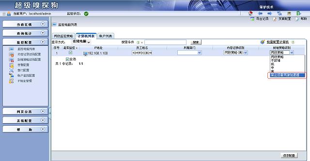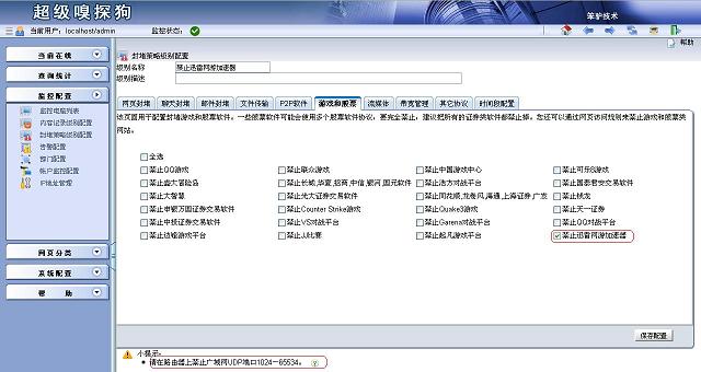進入監控配置 -> 監控電腦列表。對需要禁止的電腦進行配置,選擇“封堵策略級別”為“禁止迅雷網游加速器”,最后保存配置并應用新配置。這時迅雷網游加速器就無法為任何網游加速了,也就代表該軟件已經被封堵成功。再把想要封堵的網游加入到封堵策略就可以了。