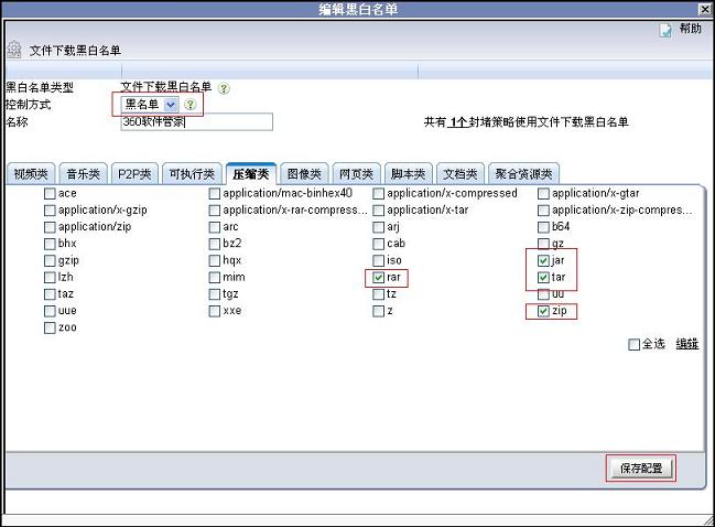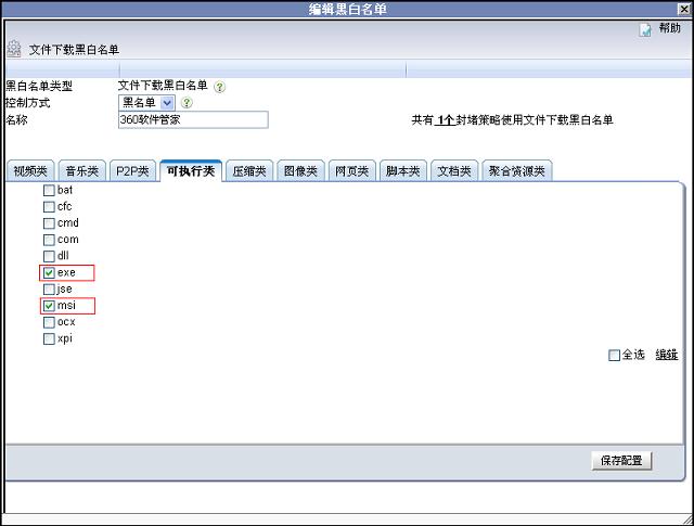 2. 在黑白名單對話框中選擇控制方式為“黑名單”,在可執行類選擇exe、msi,在壓縮類選擇jar、rar、tar、zip。最后單擊“保存配置”