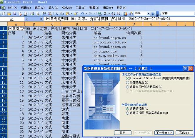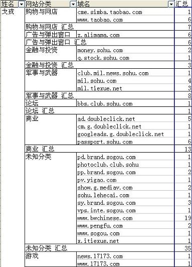 步驟4:將右邊數據透視表字段列表中的字段(姓名、網站分類、域名)雙擊添加,并把“訪問次數”在下拉列表中選擇添加到“數據域”,在左邊的區域中將會顯示統計后的結果。具體結果如下圖所示: