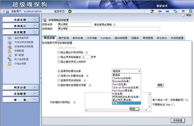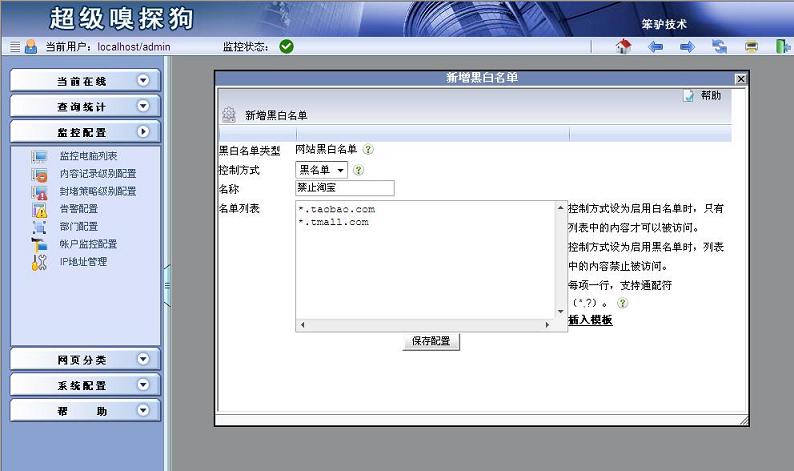 步驟二:彈出“新增黑白名單”,“控制方式”選擇黑名單,名稱中輸入“禁止淘寶”,在名單列表中輸入“*.taobao.com”和“*.tmall.com”。點擊“保存配置”。具體如下圖所示: