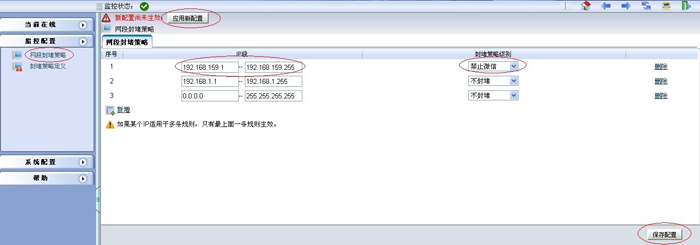 在“網(wǎng)段封堵策略”里,配置你想禁止的IP段的封堵策略級(jí)別為“禁止微信”,保存配置并應(yīng)用新配置。