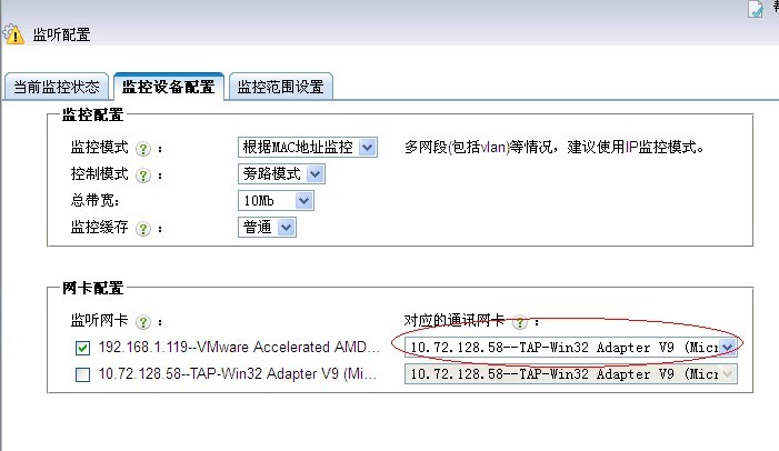 - 4. 點擊“系統配置”—>“監聽配置”—>“監控設備配置”,選擇新添加的網卡作為通訊網卡。