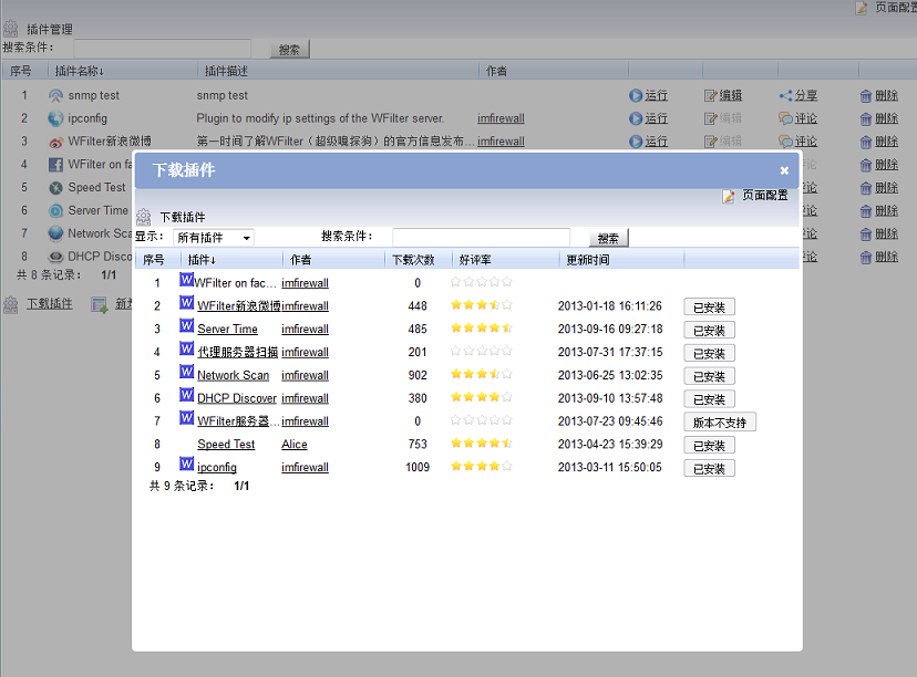 該插件系統提供了網絡管理、上網行為管理的一系列插件,如:網絡掃描、代理服務器掃描、DHCP掃描、WFilter服務器管理等多種插件。而且插件還在不斷的豐富中,您也可以開發自己需要的插件。