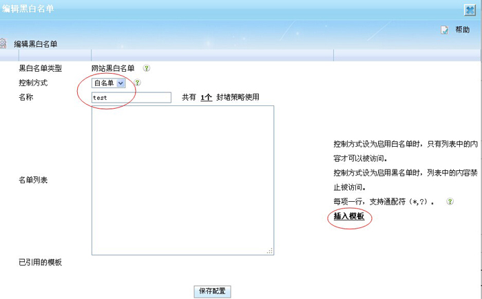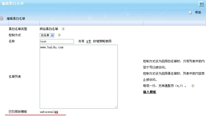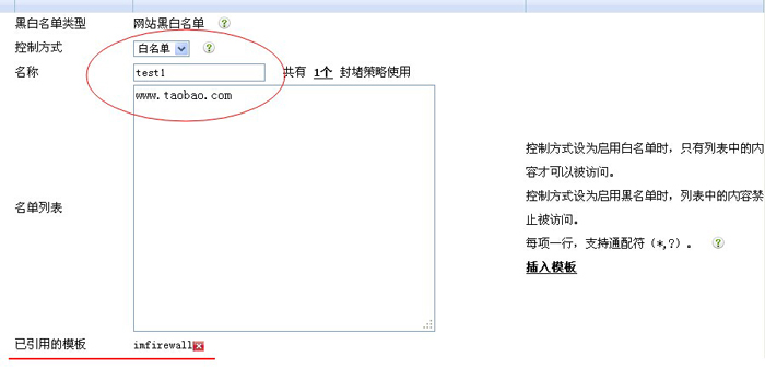 4.再新增一個test1策略,新增一個網站黑白名單test1,并引用已經建好的模板imfirewall。