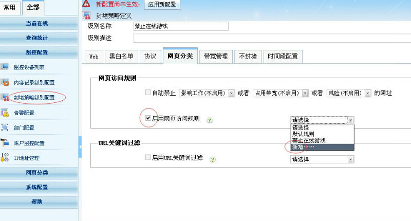 本文將介紹如何用WFIlter 4.1禁止在線游戲。下面以4399游戲網站為例,介紹配置的具體步驟: 1.在“監控配置-封堵策略級別配置”中新增封堵策略級別。輸入名稱,啟用網頁訪問規則并新增,如下圖所示:
