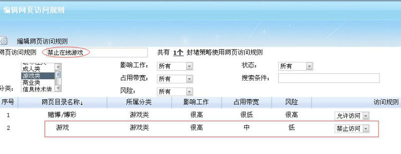 2.編輯網頁訪問規則,禁止“游戲”分類并保存,如下圖所示: