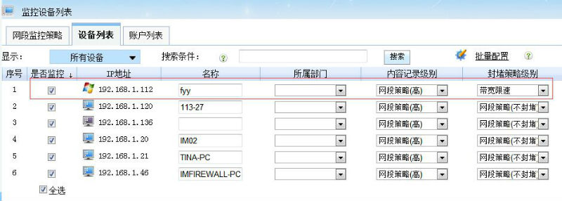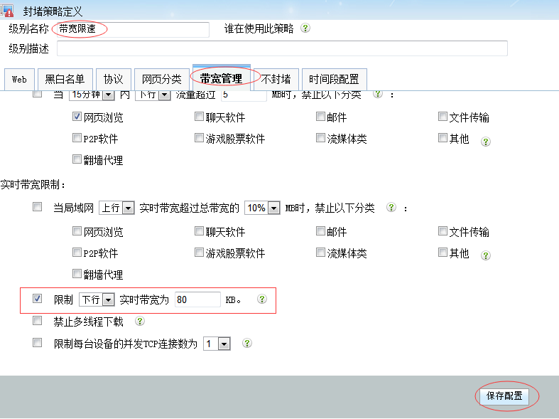 4.在“監控配置-封堵策略級別配置”中新增封堵策略級別。輸入名稱,在帶寬管理選項卡中,對下載實時帶寬進行限制,如下圖所示: