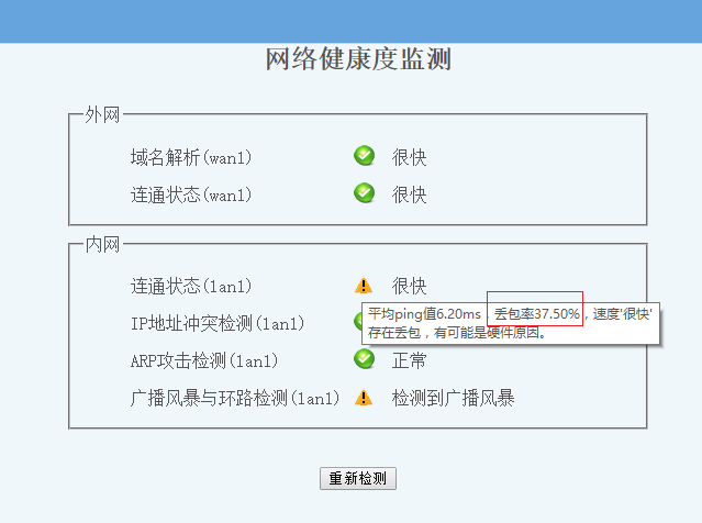 ”網絡健康度監測“插件在檢測時,會發送測試數據包。局域網中一旦有環路存在,就會出現大量的轉發,從而被檢測到。
