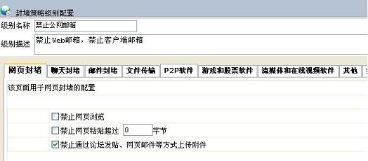 首先,我們需要先新增一個封堵策略級別.選擇"監控配置"->"封堵策略級別配置",點擊"新增級別"可以打開封堵級別配置頁面.輸入名稱,描述,對于web郵件只需在"禁止通過論壇發貼、網頁郵件等方式上傳附件"前打勾即可.如圖:
