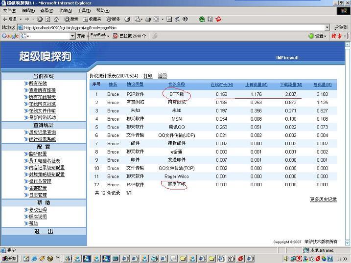 詳盡的協議統計報表,可以對各類局域網中使用過的P2P軟件、流媒體軟件、其他各類協議一目了然。