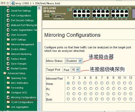 在本例中,直接在dlink2366上做端口鏡像即可,dlink2366端口鏡像的配置如下圖: