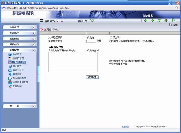 超級嗅探狗支持遠程登陸功能,不需要安裝客戶端程序,只要您知道安裝嗅探狗的IP并且有相應權限,就可以通過瀏覽器直接訪問。