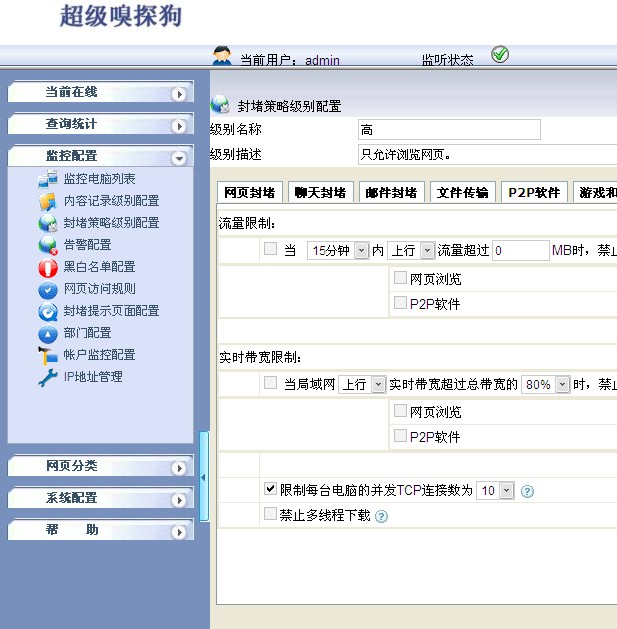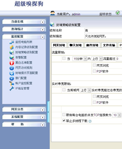 1.首先在超級嗅探狗“封堵策略級別配置”中設(shè)置,禁止多線程下載,如下圖所示: