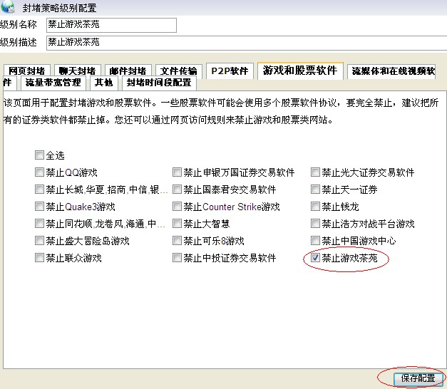 1.3 在“監控配置->封堵策略級別配置”點擊“ 新增級別”,級別名稱為禁止游戲茶苑,在“游戲和股票軟件”選項卡中增加了用戶自定義的“禁止游戲茶苑”選項,選中“禁止游戲茶苑”的復選框點擊保存。如下圖所示: