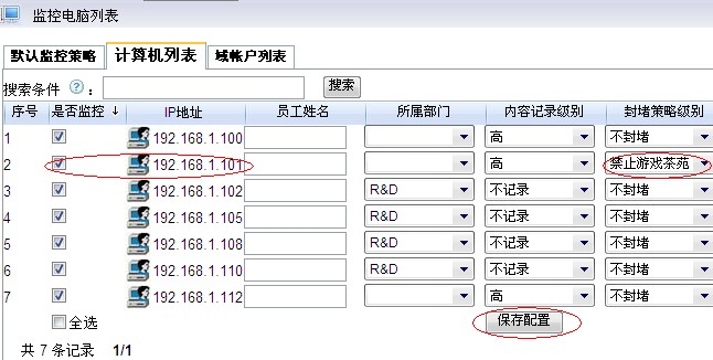 1.4 在“監控配置->監控電腦列表”里,選中要封堵的主機和封堵策略級別,保存配置并應用封堵策略,如下圖所示: