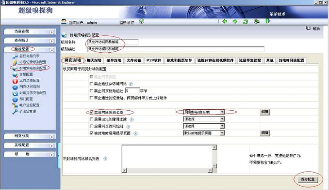 1.打開超級嗅探狗“監控配置-- >封堵策略級別配置-- >新增封堵級別”,具體配置如下圖所示: