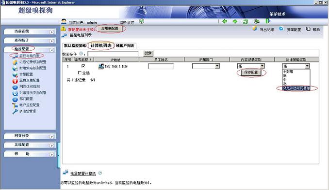 3.在“監控配置-- >監控電腦列表”中應用封堵策略,如下圖所示: