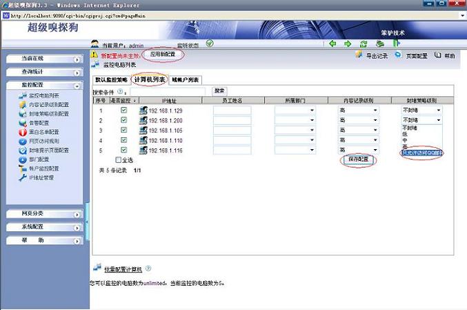 3.在“監控配置-- >監控電腦列表”中應用封堵策略,如下圖所示: