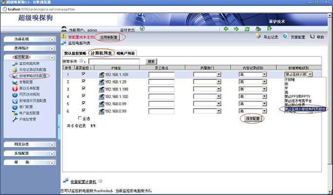 (3)在“監(jiān)控配置-- >監(jiān)控電腦列表-- >計算機列表”中應用封堵規(guī)則,如下圖所示: