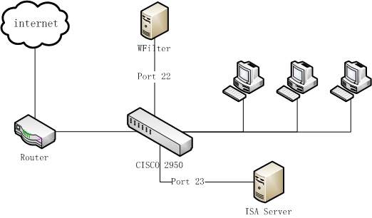 An office network uses ISA as the proxy server connected to a cisco 2950 switch, with below network topology diagram: