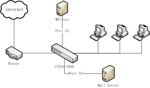 To monitor emails in this network, you need to mirror both the internet traffic and email server traffic to the WFilter computer.