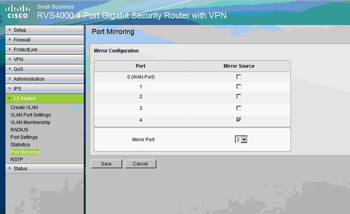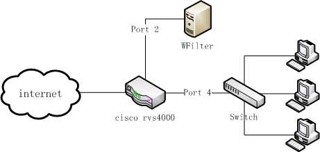 In such a network, you only need to setup a mirroring port in the cisco rvs4000 for monitoring/filtering. The below diagram shows the router's mirroring settings: