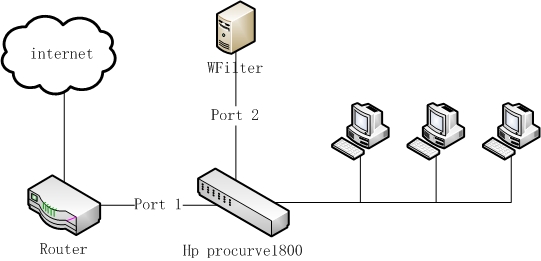 As in the diagram above, port 1 is connected to the internet router and port 2 is connected to the WFilter computer.