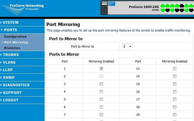 In this network, we only need to do port mirroring in the hp procurve 1800 switch to do monitoring and filtering. The below diagram shows the mirroring settings of the hp procurve switch: