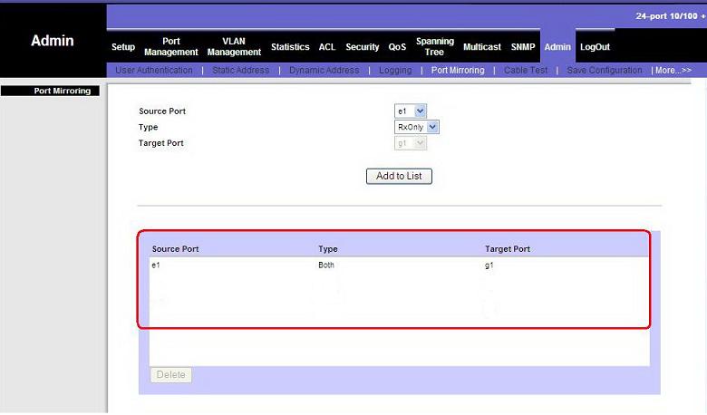 In this network, we only need to do port mirroring in the linksys srw224G4 switch to do monitoring and filtering. The below diagram shows the mirroring settings of the linksys switch: