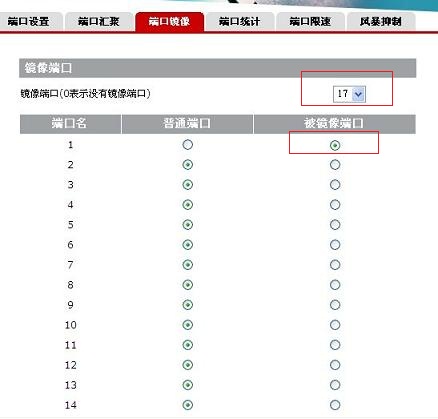 本例中,端口1設置為“被鏡像端口”接路由器,端口17設置為“鏡像端口”接WFilter監控主機。即可實現監控。