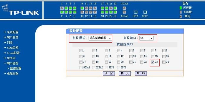 本例中,端口23設(shè)置為“被鏡像端口”接路由器,端口24設(shè)置為“鏡像端口”接WFilter監(jiān)控主機(jī)。即可實(shí)現(xiàn)監(jiān)控。